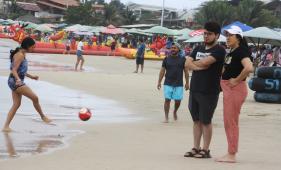Los visitantes disfrutaron en la arena y el mar a pesar de la baja temperatura