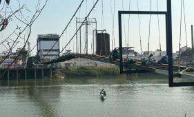 Familias cruzan el río Babahoyo en canoa mientras esperan la reapertura del puente