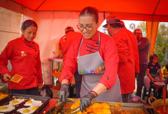La Red de Plazas y Mercados llevó al escenario la fortaleza de sus mujeres, quienes preparan llapingachos desde tiempos de sus abuelas. Paola Salazar resaltó que es la cuarta generación dedicada a esta receta. “Seguiremos llevando la tradición”, afirmó con orgullo.