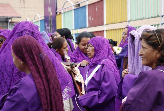 Tradicionales cucuruchos y verónicas se alistan atrás de la iglesia San Francisco para la procesión que tiene más de 60 años