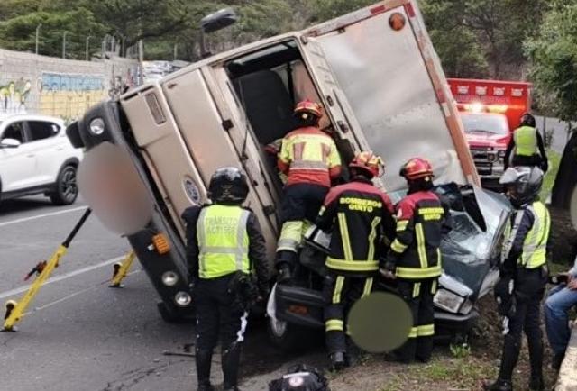 El Cuerpo de Bomberos de Quito informó que producto del volcamiento, una persona quedó atrapada en la camioneta. Los socorristas estabilizaron el automotor para extraer a la víctima y "brindarle atención prehospitalaria".