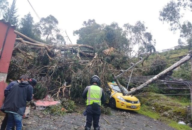 La caída de un árbol y de un poste causó daños en una casa y en un taxi en Conocoto