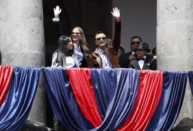 A las 11:30, el presidente Daniel Noboa apareció junto a su esposa, Lavinia Valbonesi. Desde lo alto del Palacio acompañó con aplausos los acordes del Trío Galante, que interpretó temas tradicionales como El Chulla Quiteño.