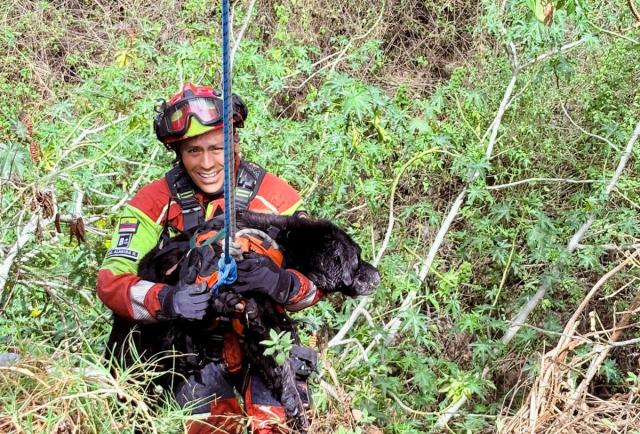 Cuando lo lograron, uno de los especialistas a cargo lo aseguró con un arnés y lo sujetó junto a su cuerpo para subir juntos con la ayuda de sus compañeros y las cuerdas.