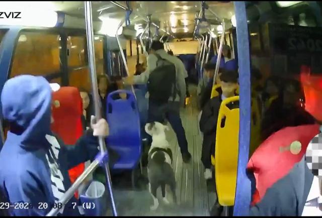 En las imágenes se observa cómo cuatro delincuentes suben a la unidad junto a un perro, aparentando ser pasajeros comunes. Tras pagar el pasaje y avanzar pocos minutos en el recorrido, el asalto se pone en marcha: uno de los sujetos intimida al conductor con un arma de fuego, mientras los otros tres despojan de sus pertenencias a los usuarios, armados con cuchillos.