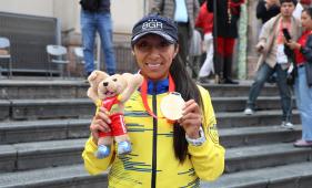 La maratonista inauguró el medallero dorado del Team Ecuador en los Juegos Bolivarianos. Dedicó la presea a su familia