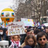 Un cartel en rechazo a la reforma de las pensiones en el Arco del Triunfo de París