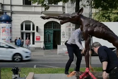 Un artista aleman planta una estatua de un lobo nazi frente a la sede de AfD